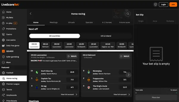 Horse racing betting markets are another area in which LiveScore Bet is especially strong. When loading the horse racing tab, users are presented with a clean interface that displays all races that day. At the top of the page, these are ordered by their off time, and when scrolling further down the page, a