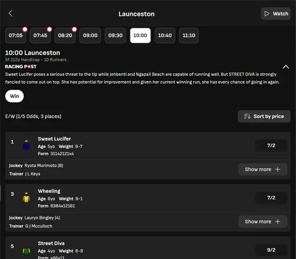 Like with most other major sportsbooks, LiveScore bet also sees all horse racing betting markets come hand in hand with additional information relating directly to a race. Each horse displays its age, weight, form, jockey and trainer prominently on screen, with some additional