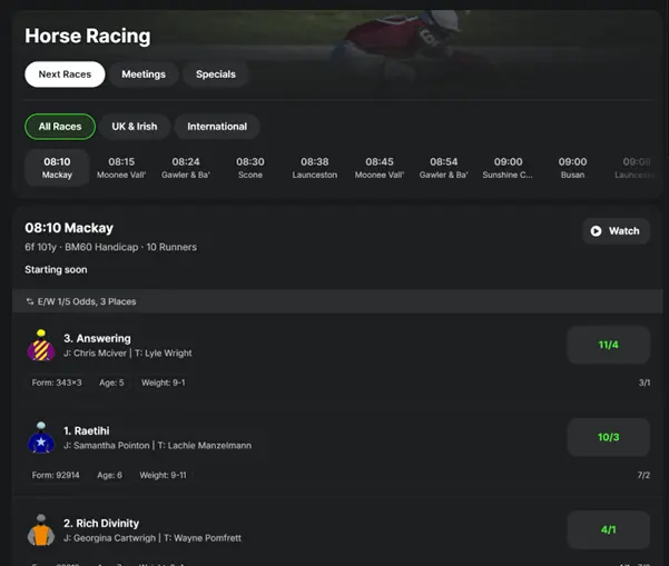 Another dynamic feature at Midnite is its price boosts. Selected horse races receive increased odds, often covering individual runners as well as the entire field. These boosts often appear around high-profile events and are also seen across a variety of other Midnite betting markets.