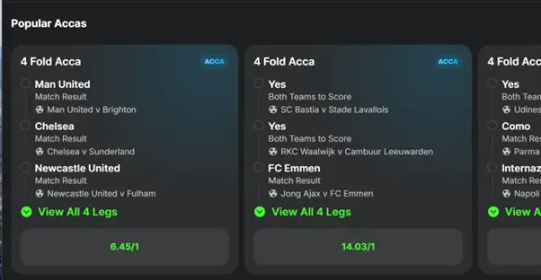 Highlighting accumulator bets that other users have placed, the ‘Popular Accas ' section is another unique component that adds to the Midnite betting experience. This provides insight into trending selections that are frequently chosen across the platform.