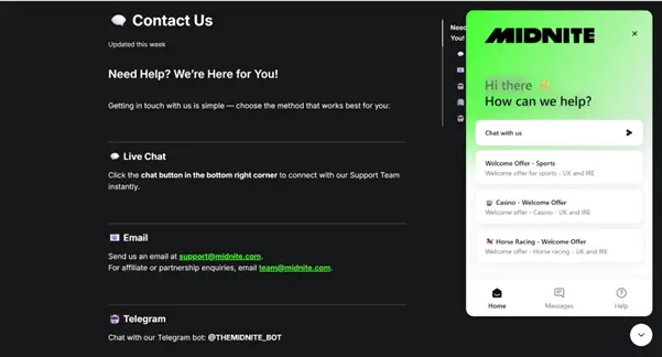 When it comes to customer support, Midnite delivers efficiently, with a variety of accessible tools and channels. Users can find the help centre, which contains FAQ’s about deposits, withdrawals, and promotions on the site, among some other things. Midnite also includes a live support chat feature, allowing users to send questions or queries to a team for help resolving them. Furthermore, the platform also provides its support email address and Telegram handle so users can get in touch via these alternative channels if they wish.