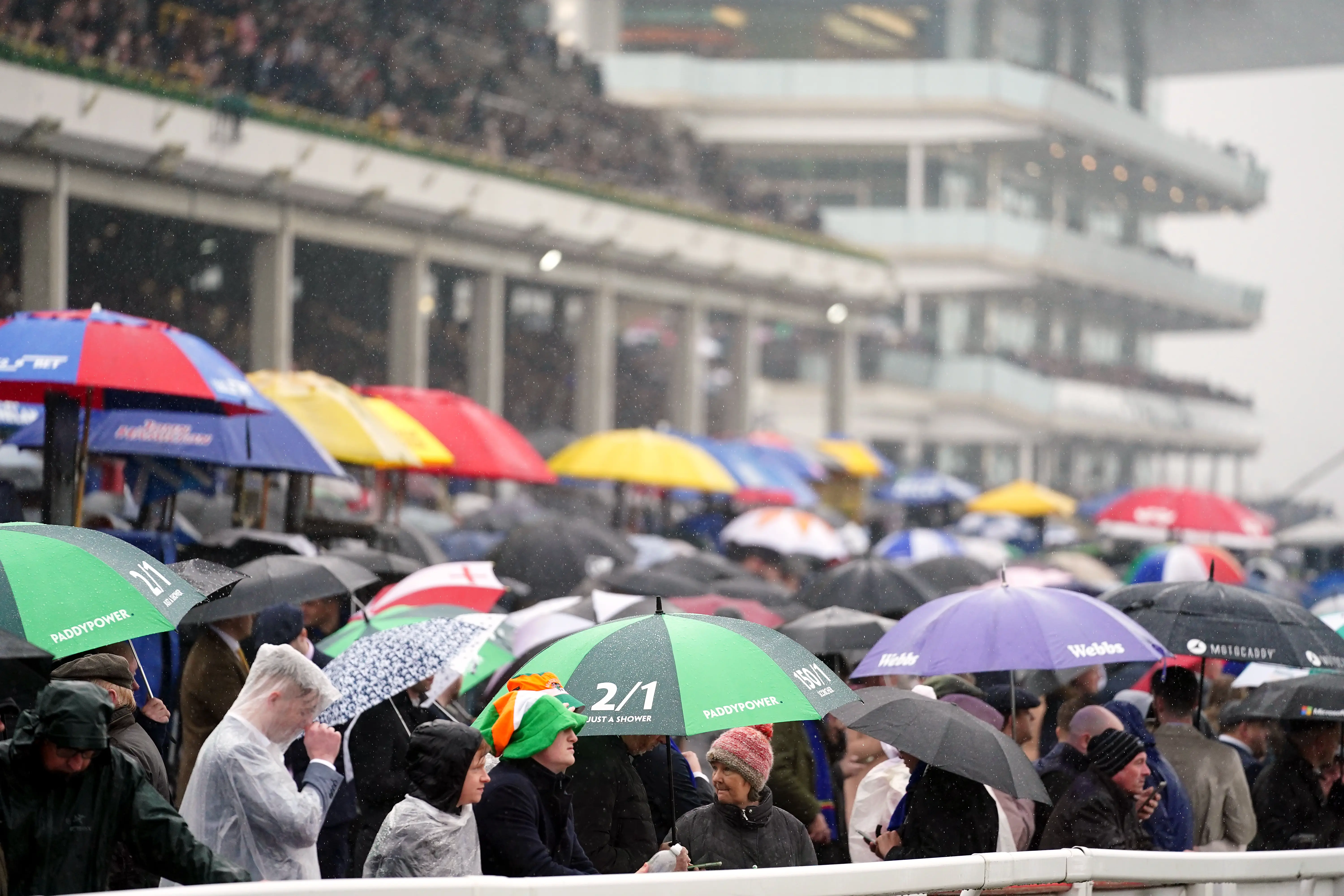 Umbrellas were the order of the day on the second afternoon of the Cheltenham Festival in March (David Davies/PA)