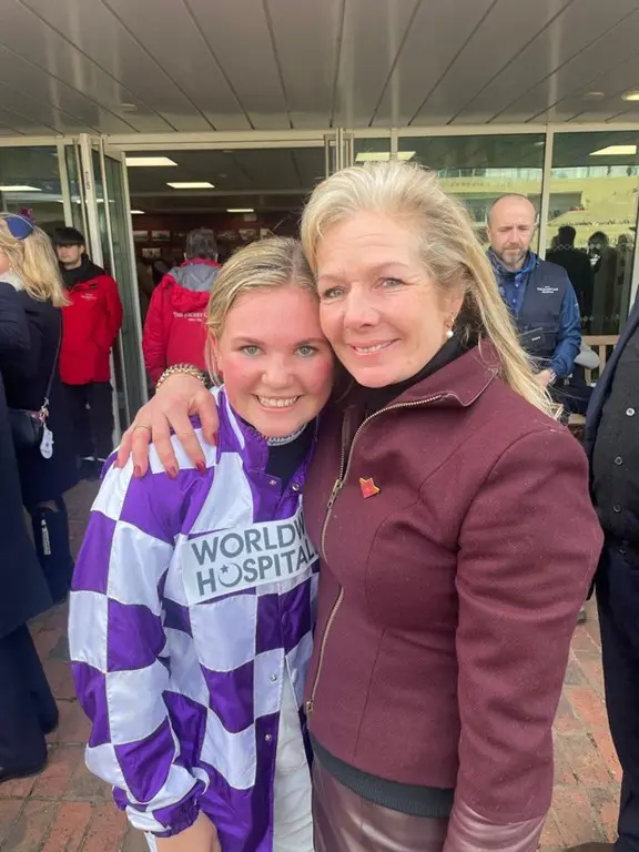 Olive Nicholls with her mother Georgie after riding Shantou Flyer (Fiona Browne/PA)