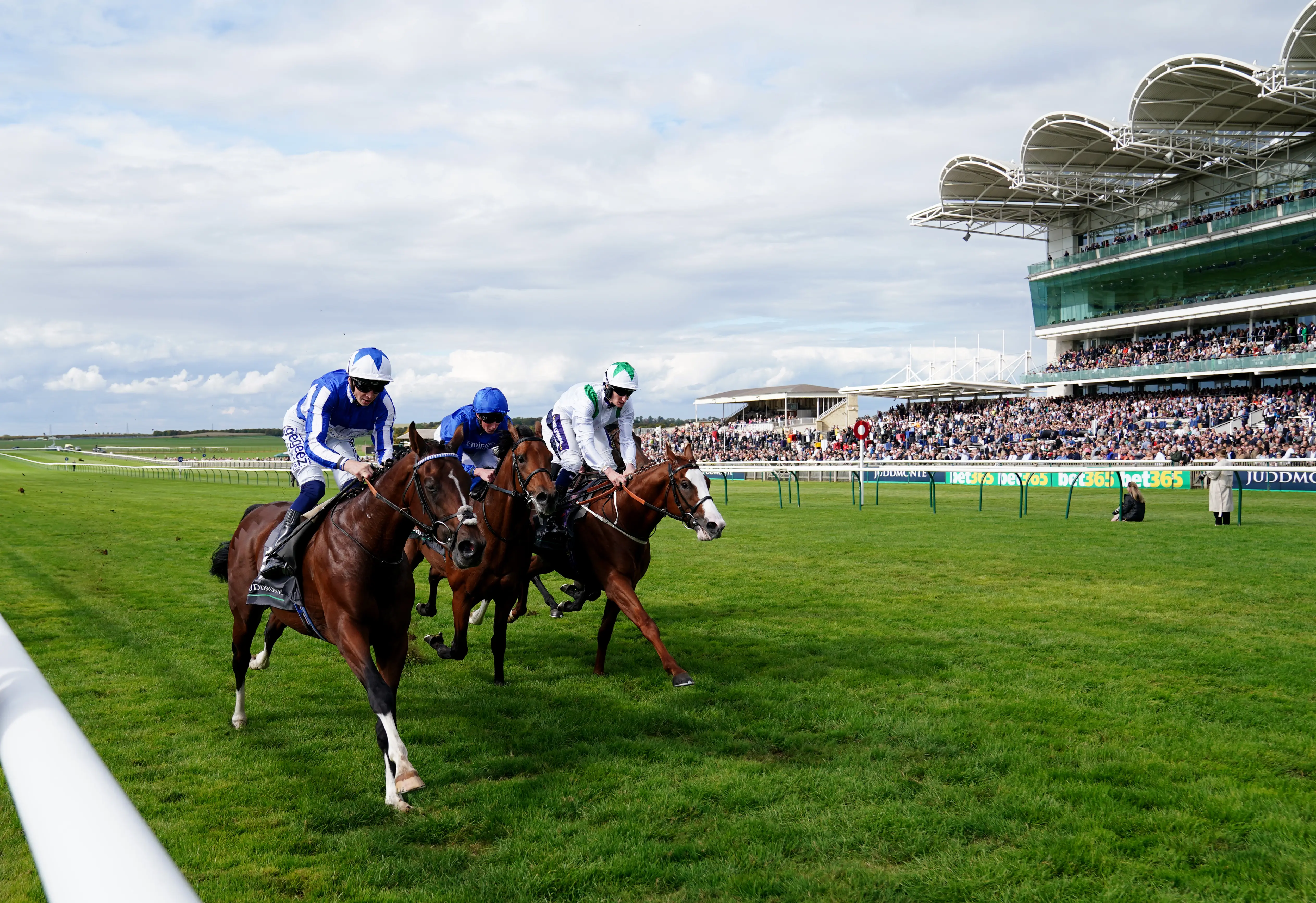 The Foxes (left) ridden by jockey David Probert on their way to winning the Juddmonte Royal Lodge Stakes at Newmarket