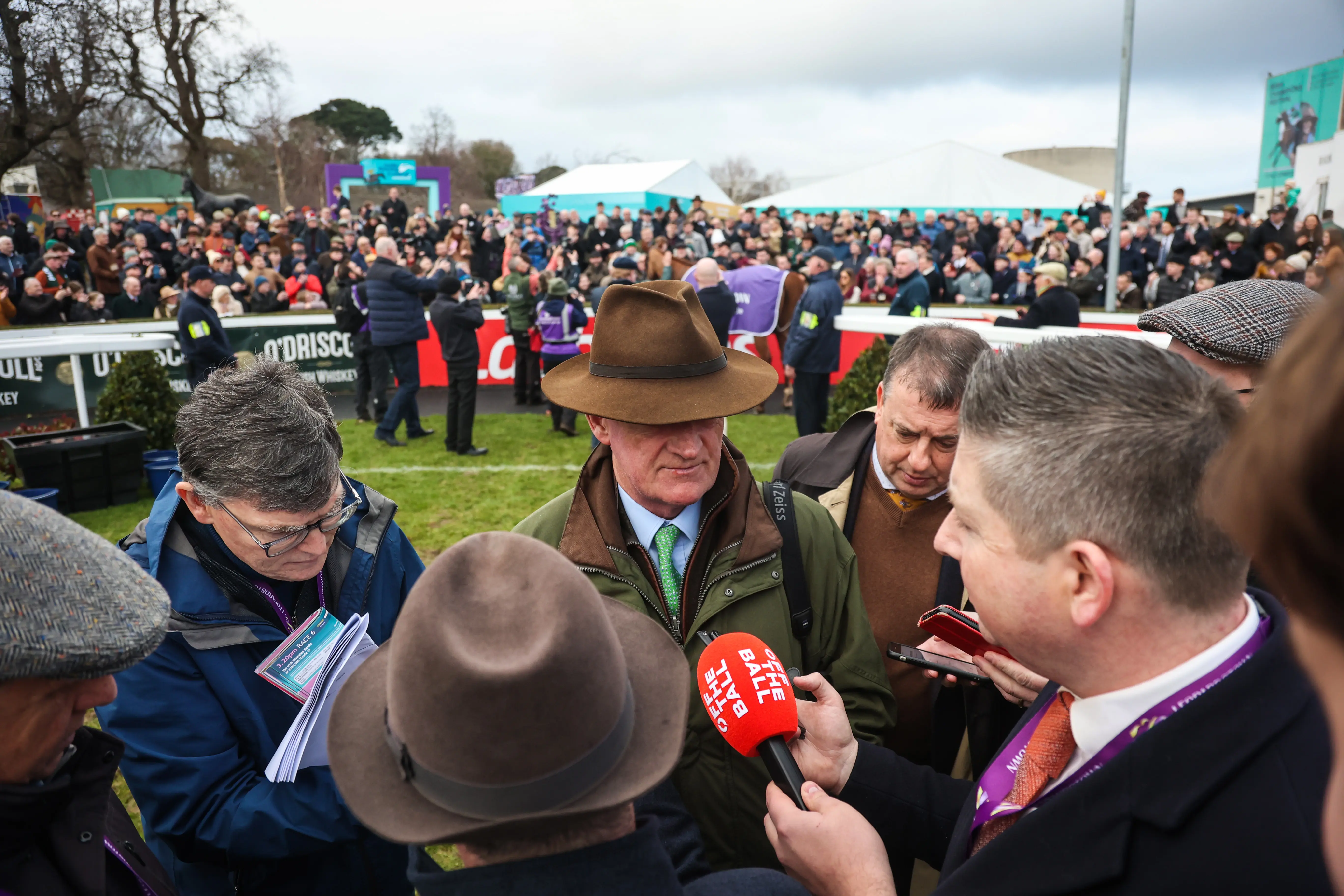 Willie Mullins surrounded by the media at Leopardstown on Sunday (Evan Treacy/PA)