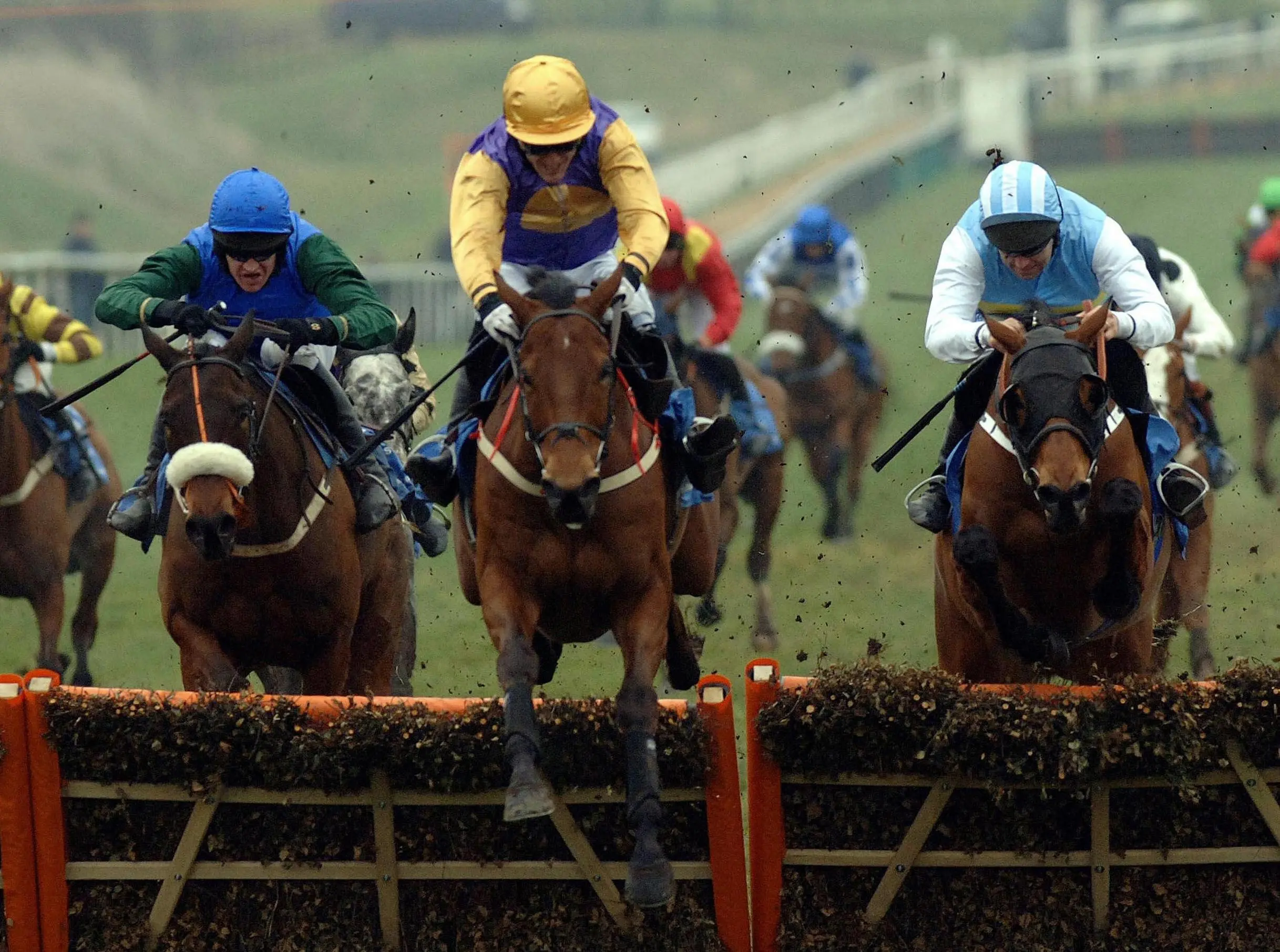 Brave Inca leads Macs Joy (left) and Hardy Eustace over the last in the 2006 Champion Hurdle