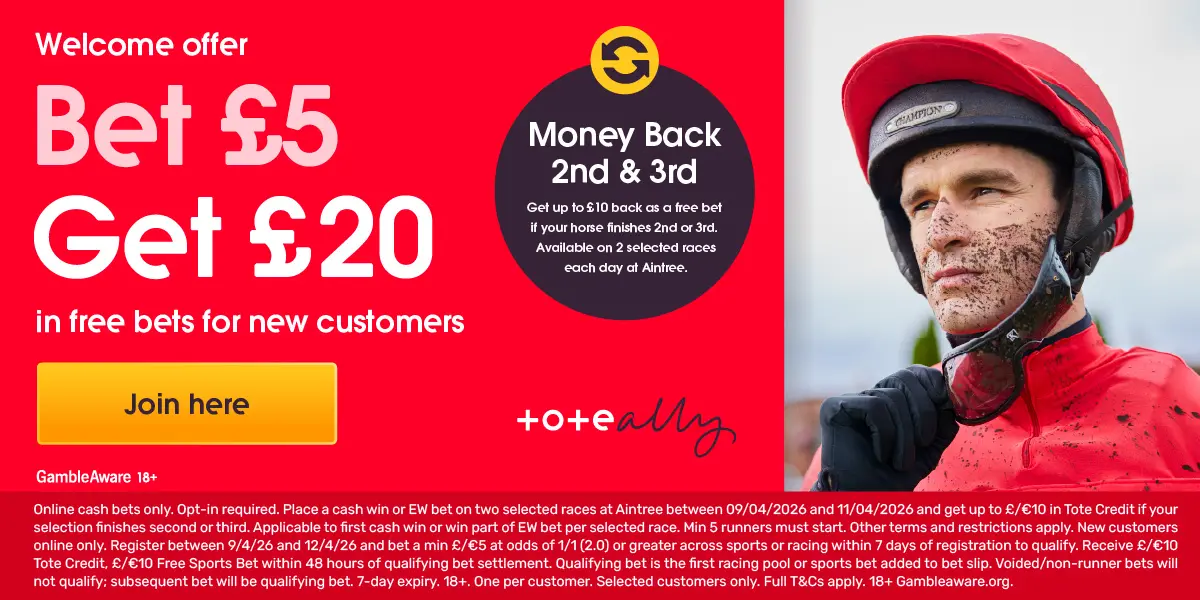 Bet £5 Get £20 in Free Bets with Tote for the Grand National New customers online only. Register between 9/4/26 and 12/4/26 and bet a min £/€5 at odds of 1/1 (2.0) or greater across sports or racing within 7 days of registration to qualify. Receive £/€10 Tote Credit, £/€10 Free Sports Bet within 48 hours of qualifying bet settlement. Qualifying bet is the first racing pool or sports bet added to bet slip. Voided/non-runner bets will not qualify; subsequent bet will be qualifying bet. 7-day expiry. 18+. One per customer. Selected customers only. Full T&Cs apply. Gambleaware.org.