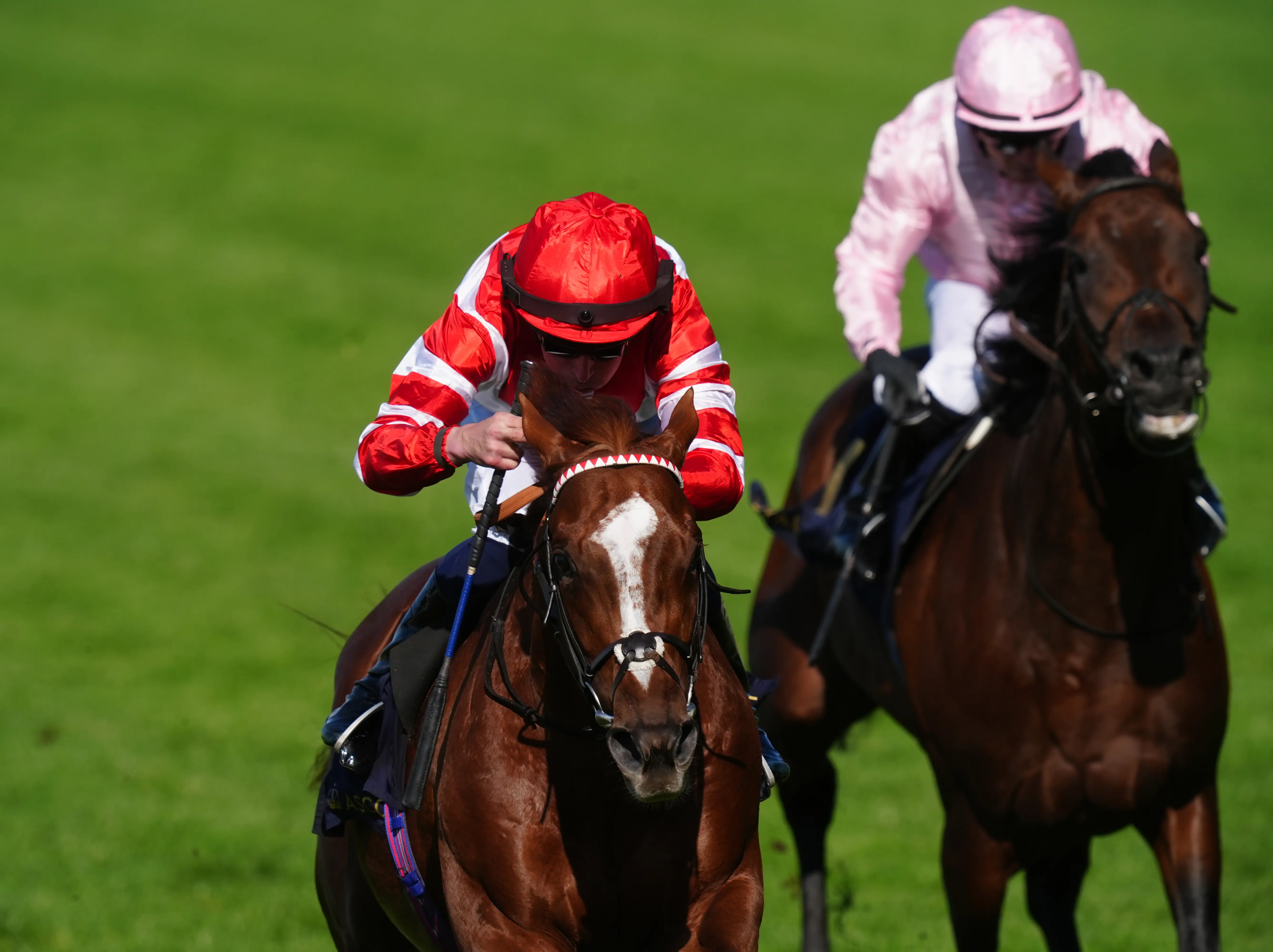 Kikkuli (pink hat) is touched off by Haatem in the Jersey Stakes (John Walton/PA)