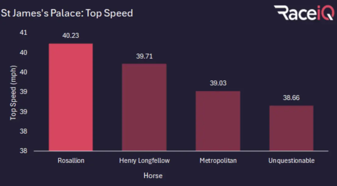 That speed proved crucial at Royal Ascot and he hit the front too soon in the Guineas at Newmarket which left him a sitting duck for Notable Speech.Sean Levey has made sure that mistake hasn’t been made since, and it is for this reason he will be very difficult to beat.He got a lovely tow into the race from Henry Longfellow at Royal Ascot and Levey timed his challenge to perfection. Rosallion’s raw speed quickly put the race to bed, and he posted a Top Speed of 40.2 mph. He was also the only horse in the race to break 40mph.I expect this will be a tactical affair, but however the race plays out, it’s hard to see what tactics could be implemented to blunt this horse’s raw ability.