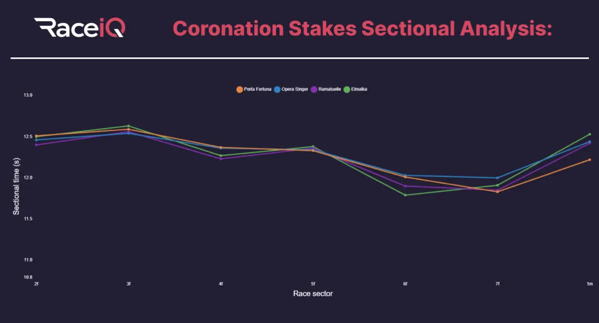 Comparing her sectionals in the Coronation Stakes with Opera Singer is interesting, too. Elmalka gave away 0.64 seconds to Opera Singer in the first furlong and was only beaten 0.48 seconds by her at the finish. Elmalka also posted the second-fastest furlong of the runners (11.79 seconds) three furlongs from home which brought her into contention. Porta Fortuna and Opera Singer were strong at the line, though, and she was always going to struggle to catch them.