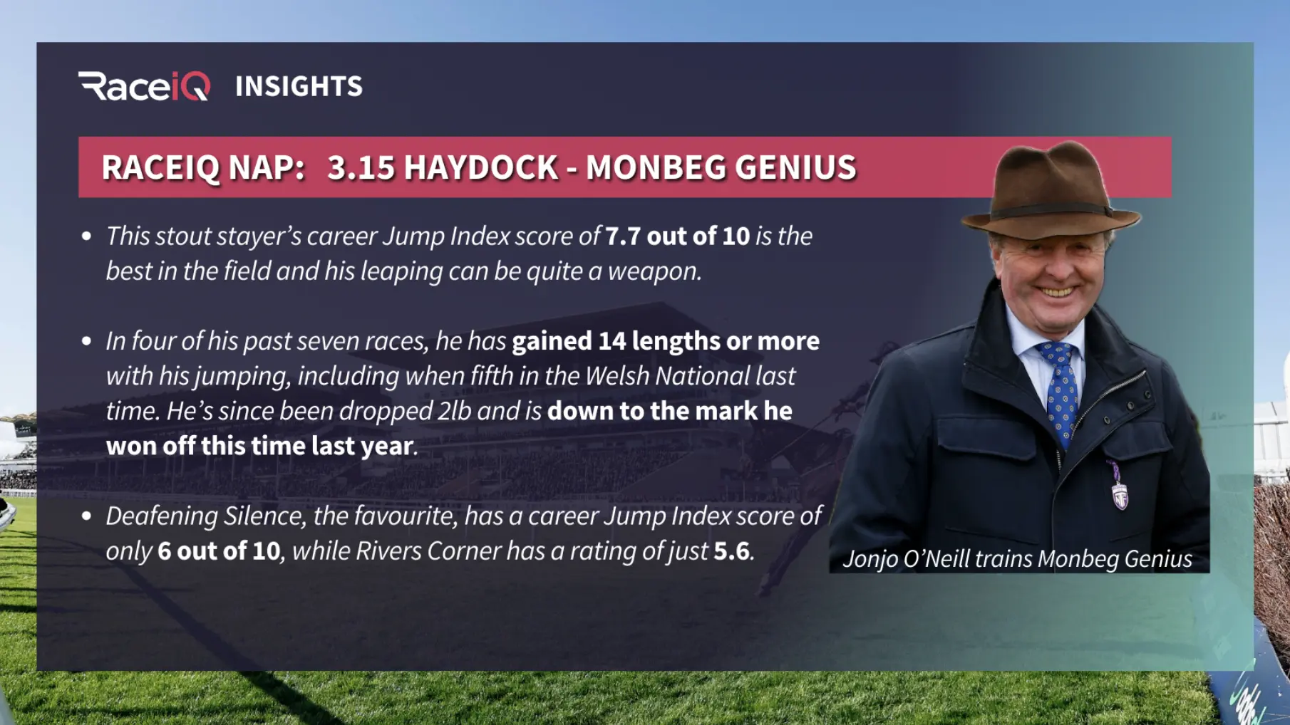 Andy writes: Monbeg Genius been something of an underachiever since finishing on the heels of Corach Rambler and Fastorslow in the Ultima at Cheltenham three years ago, but he ran well in the Welsh National for the second successive year last time, when keeping-on to be fifth on ground that was probably livelier than he prefers.
