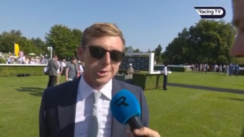 Joint-trainer Ed Crisford reacts to the victory of the exciting juvenile at Goodwood