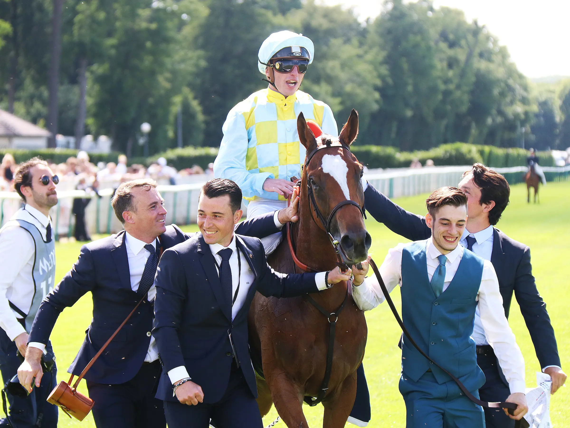 Channel and her delighted connections after landing the French Oaks (Focusonracing)