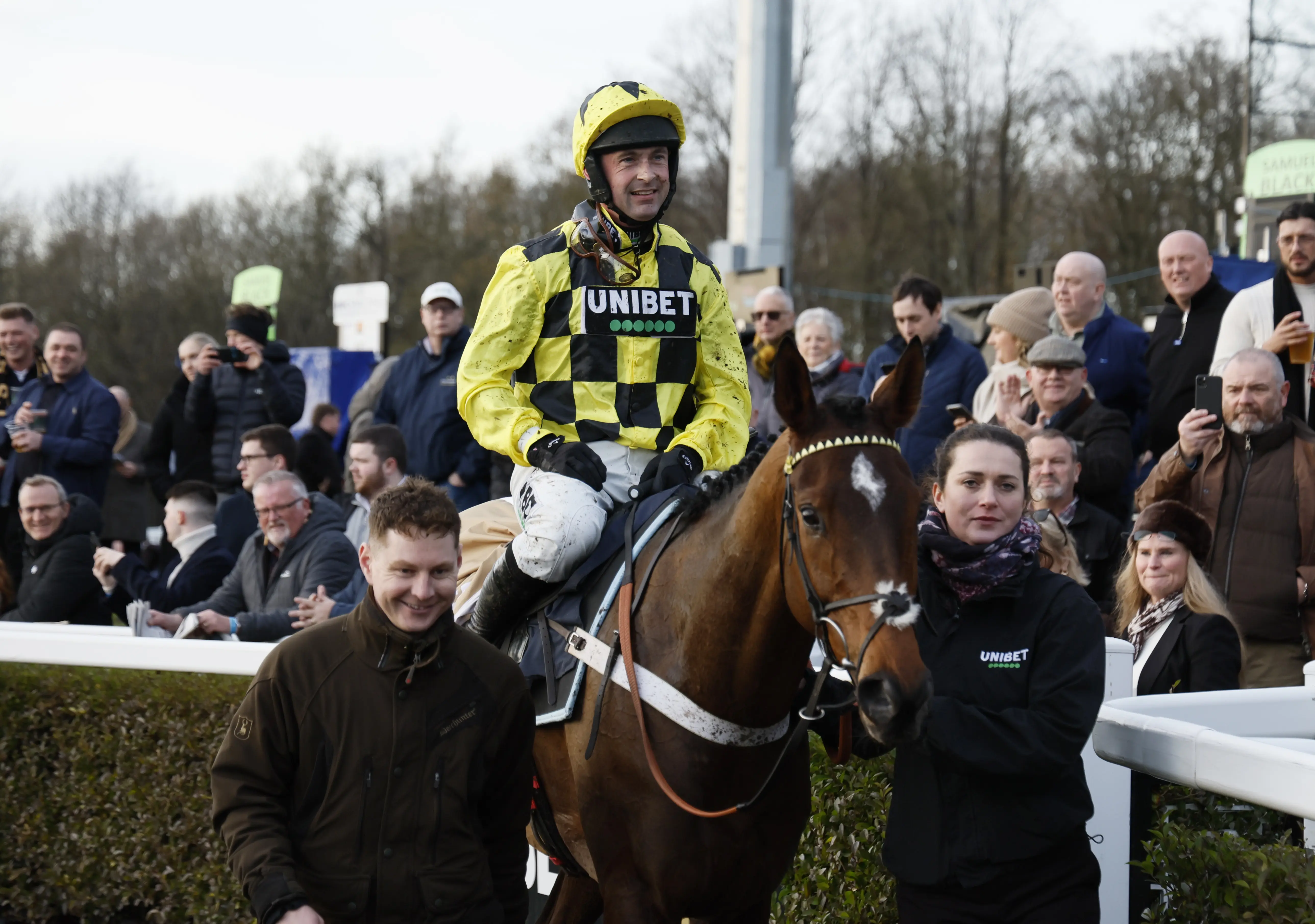 The previously unbeaten six-year-old was pulled up sharply by Nico de Boinville in the Unibet Hurdle and while the silenced crowd initially feared the worst, he was able to walk into the horse ambulance before being transported to Three Counties Equine Hospital.