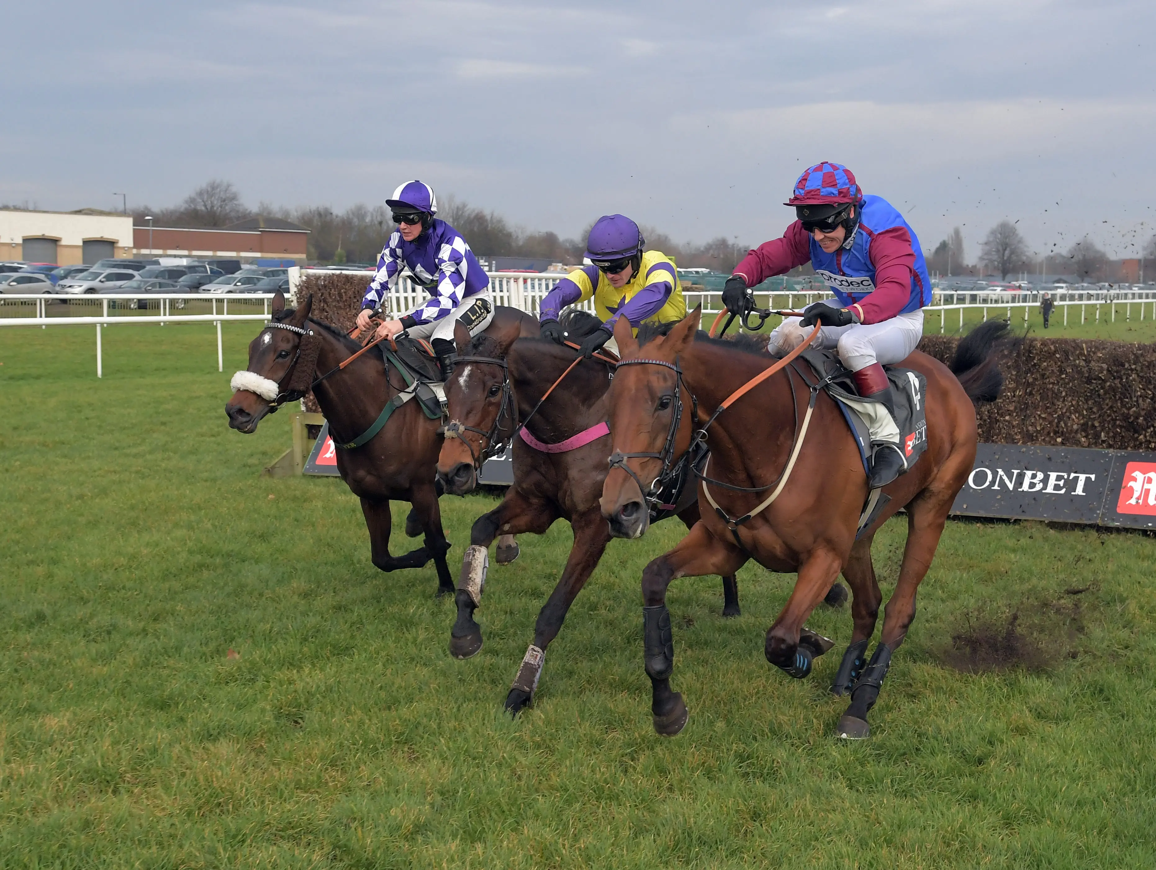 Lady Buttons, left, Happy Diva, centre, and La Bague Au Roi are locked together after the last at Doncaster (Focusonracing)