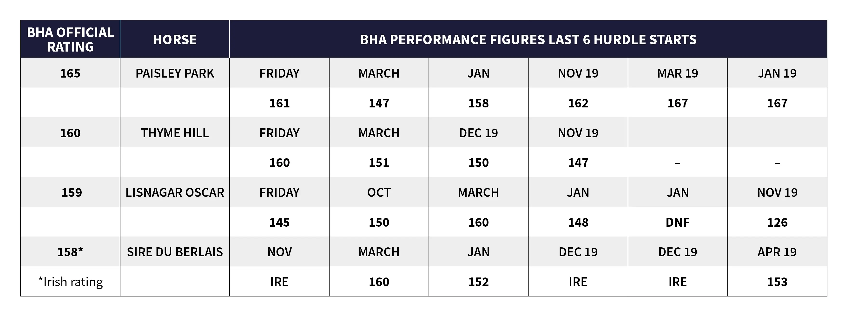 This pair now head the ante-post market for the Stayers’ Hurdle, with some bookmakers placing Thyme Hill marginally ahead. This very much reflects the current state of play because, as the below table/graph illustrates, it’s been 20 months since Paisley Park last posted a performance much above what Thyme Hill has already achieved on his first start outside novice company, even though he’s still officially rated 5lb higher by the BHA.