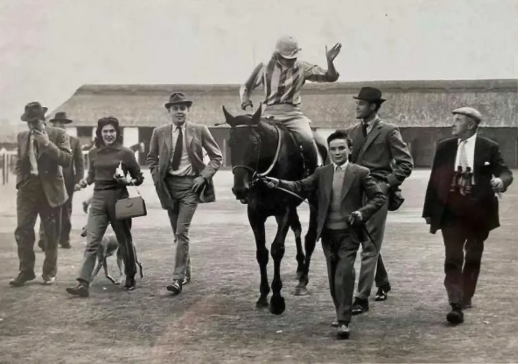 Julie Cecil celebrates her Newmarket Town Plate success on Adam’s Walk in 1959 (The Jockey Club)