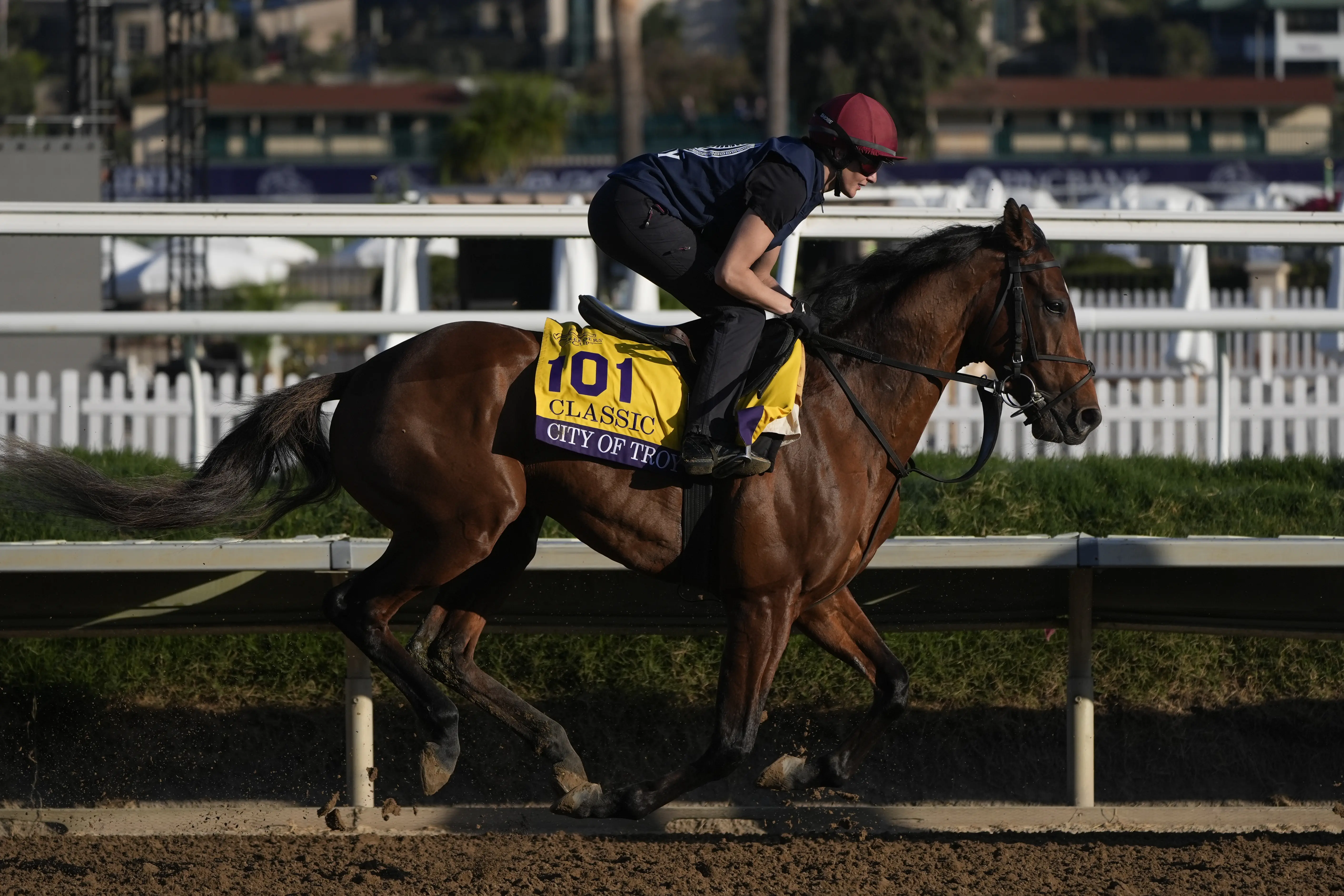 Rachel Richardson rides City Of Troy at Del Mar (AP Photo/Gregory Bull)