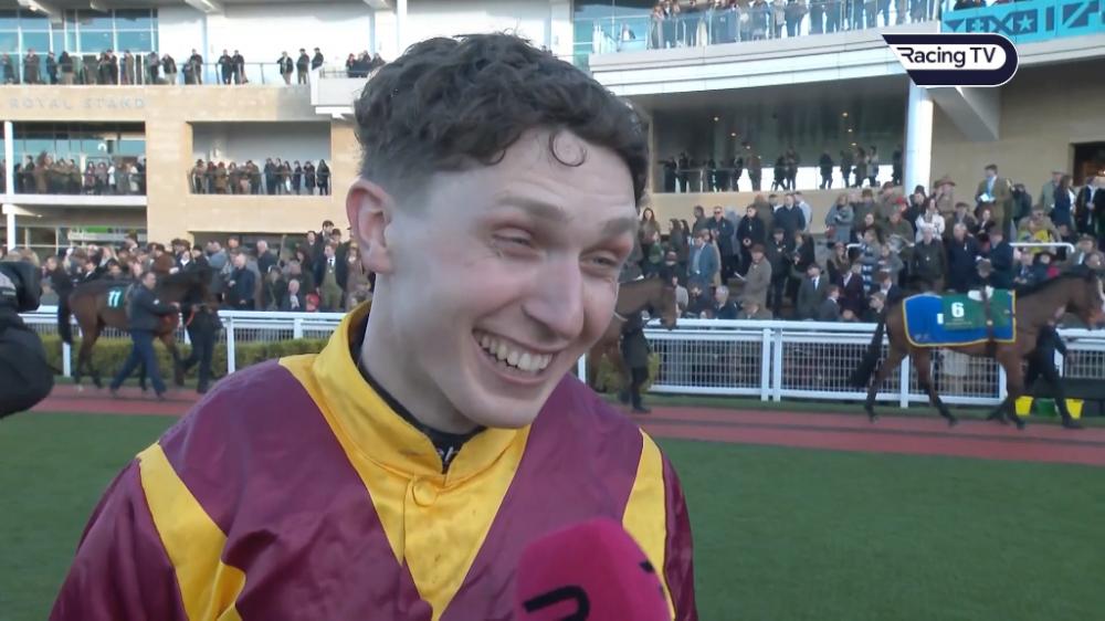 Henry Crow spoke to Lydia Hislop after landing the Hunters' Chase at Cheltenham on Friday.