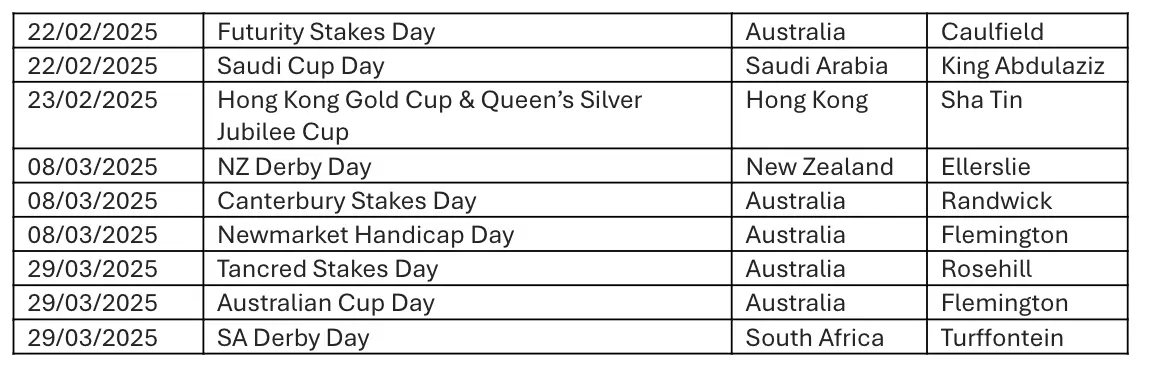 World Pool’s next fixtures will be Futurity Stakes Day at Caulfield, Australia, and Saudi Cup Day at King Abdulaziz, Saudi Arabia, on Saturday 22nd February, followed by the Hong Kong Gold Cup and Queen’s Silver Jubilee Cup at Sha Tin on the Sunday.