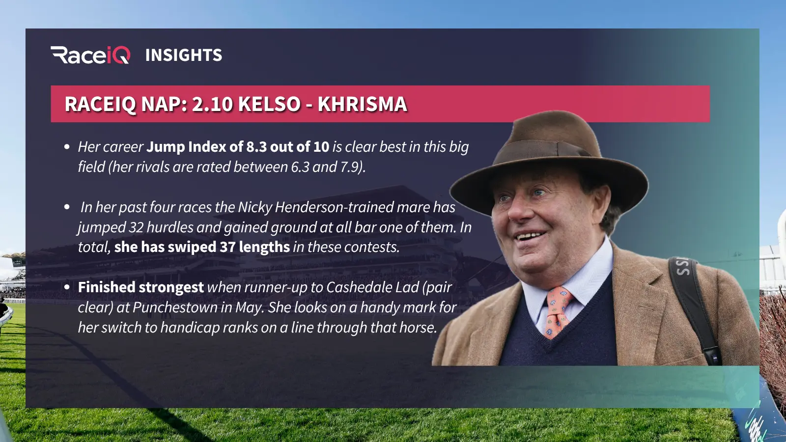 RaceiQ's dats suggests Pismo Beach is a much better jumper than this time last year and her form up until a tame effort in the mud at Ludlow last time, where she bled, had been solid.