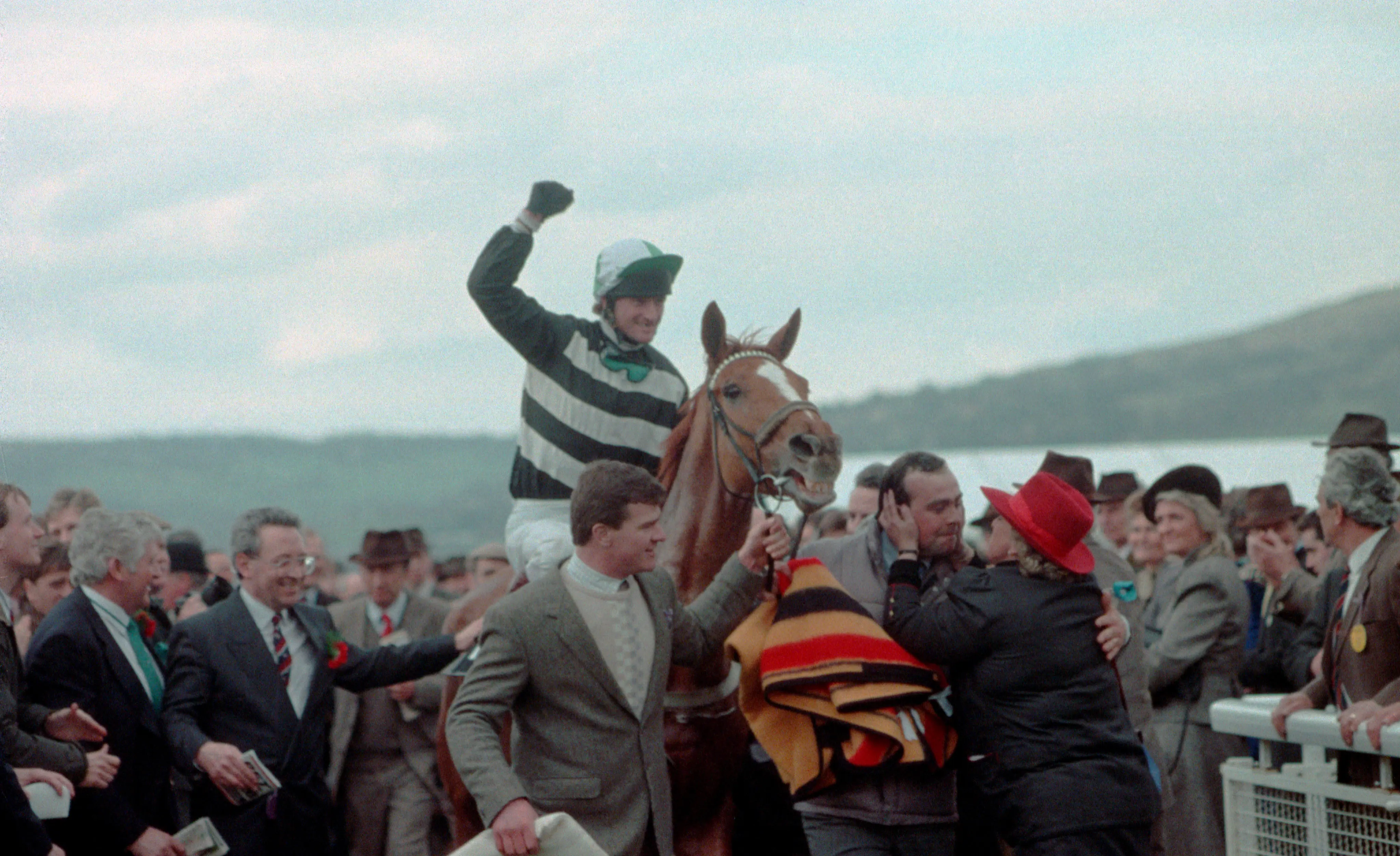 Desert Orchid gets a “well done” pat from smiling jockey Simon Sherwood (Barry Batchelor/PA). Possibly the most popular triumph in the whole history of this great race, as the flying grey was an icon who transcended the sport!