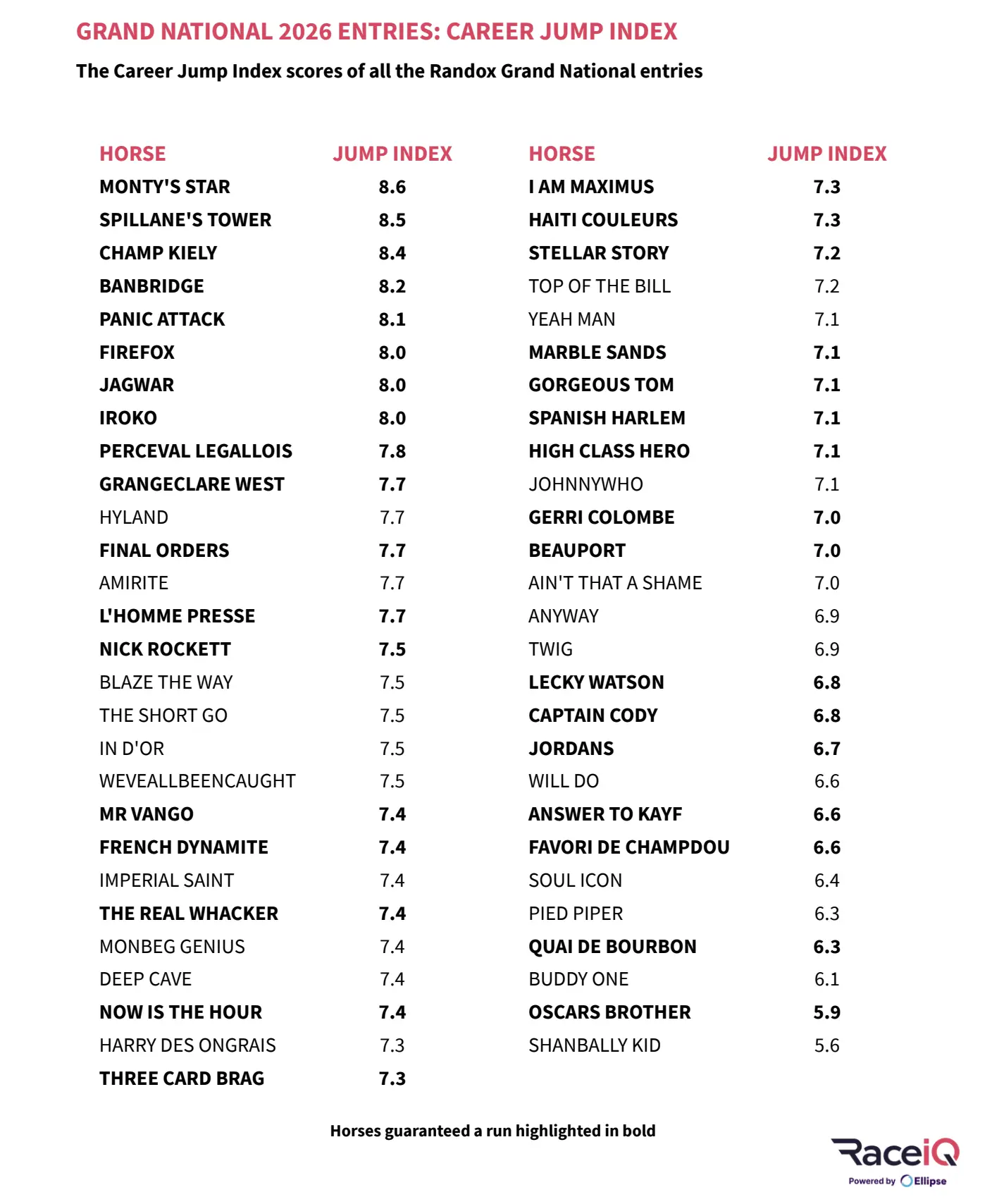 With Saturday’s big race in mind, it is perhaps worth paying extra attention to those runners whose Career Jump Index score is 7.6 or higher, as it gives them a solid starting base.