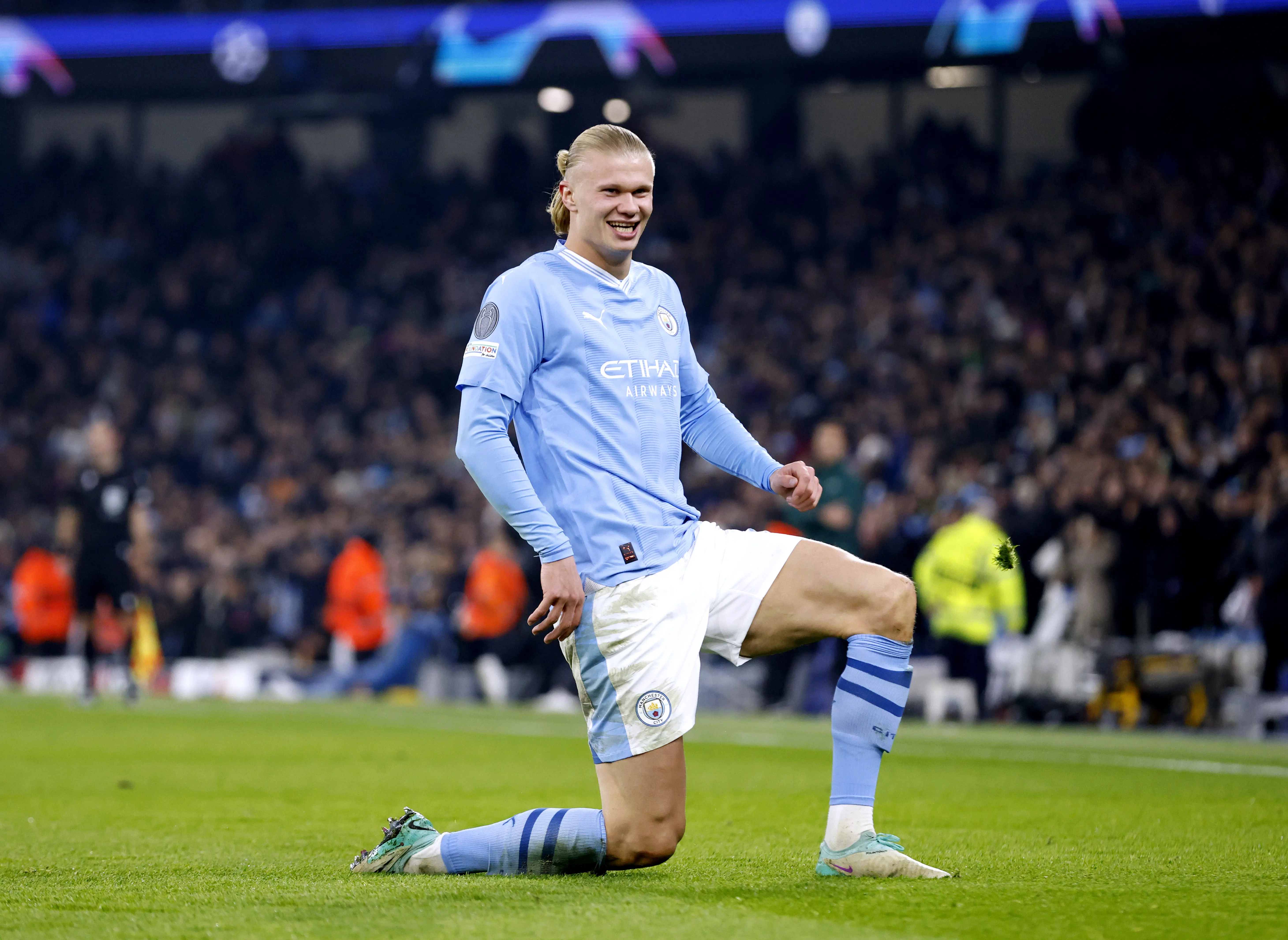 Manchester City’s Erling Haaland celebrates scoring in the Champions League (Richard Sellers/PA)