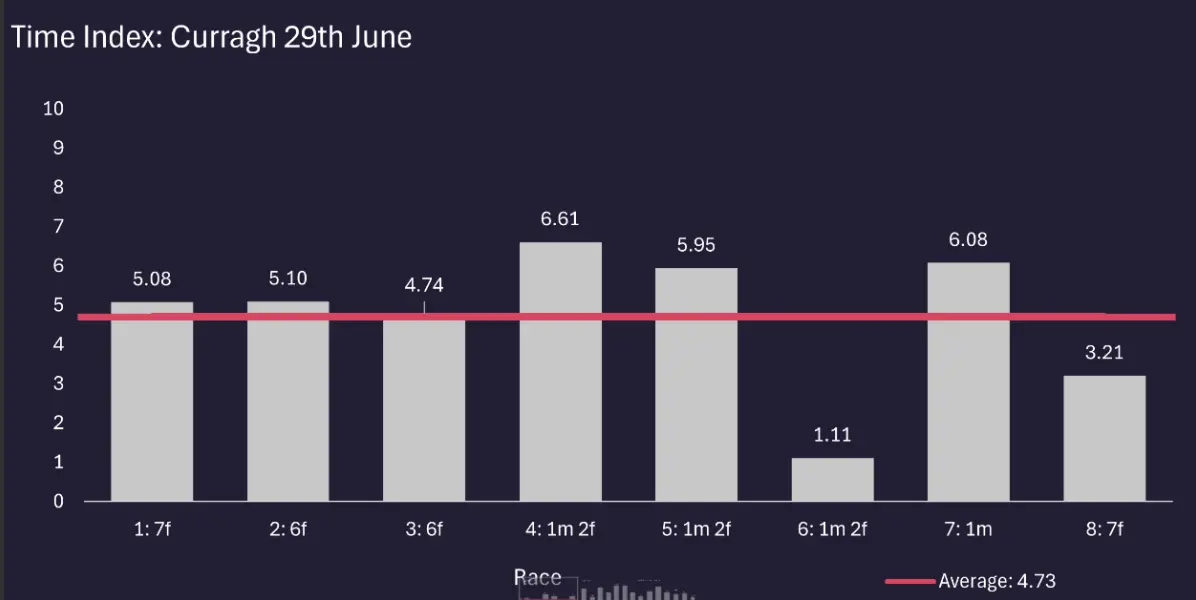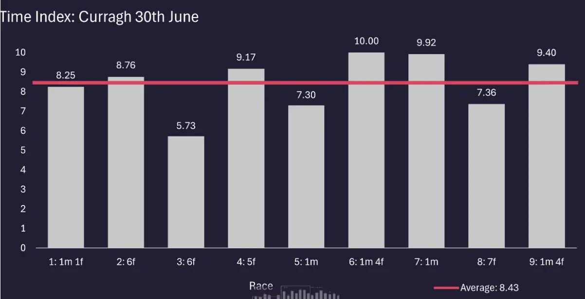 The RaceiQ Time Index scores, which look at the times achieved and compares them historically with times achieved on the same ground in the same class of races, shows that there was a marked difference in the going on both days, and suggests that it dried out considerably following racing on Saturday.
