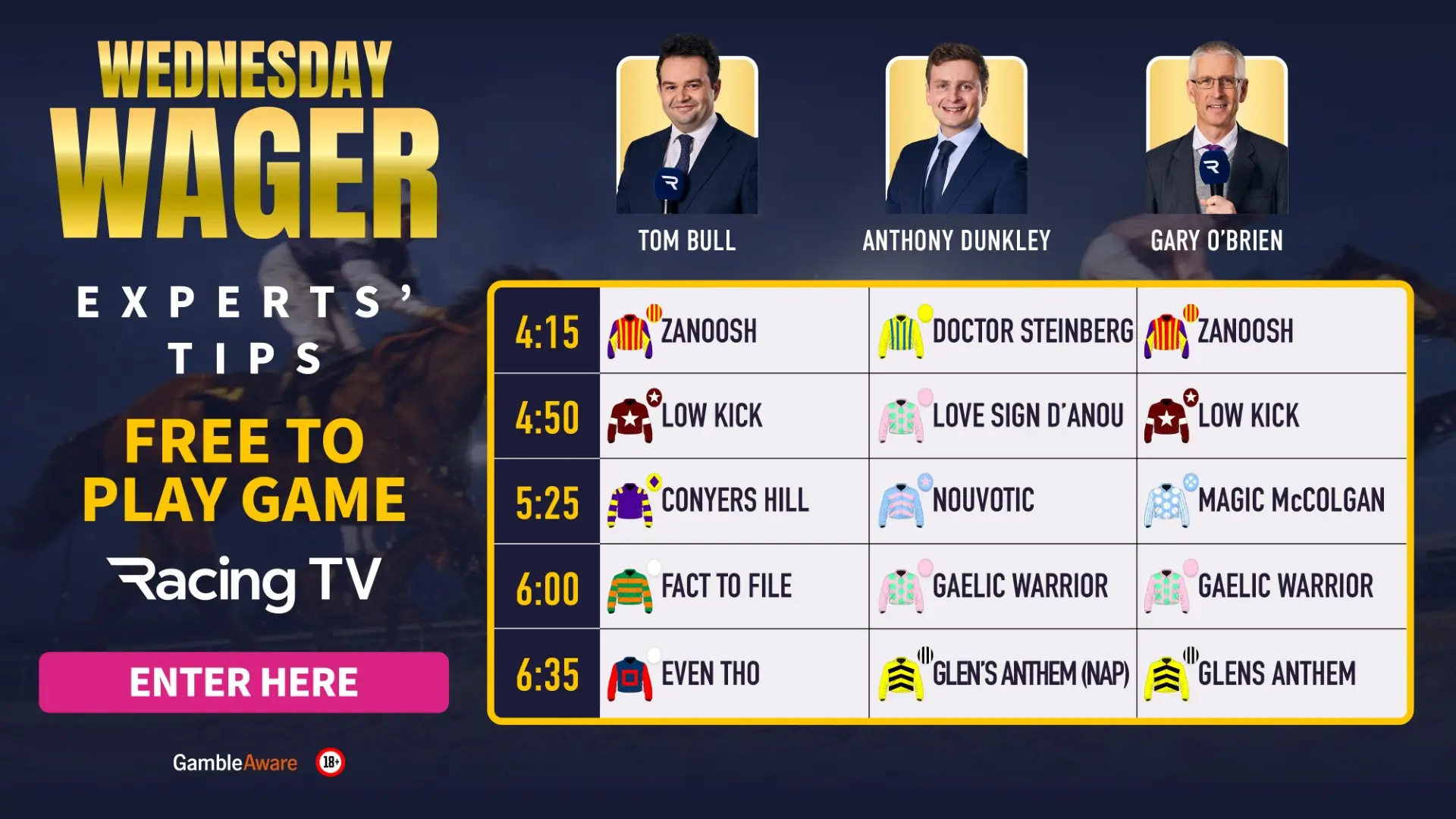 If any of your selections are declared as a non-runner, they will be replaced by the S.P. favourite of the race.