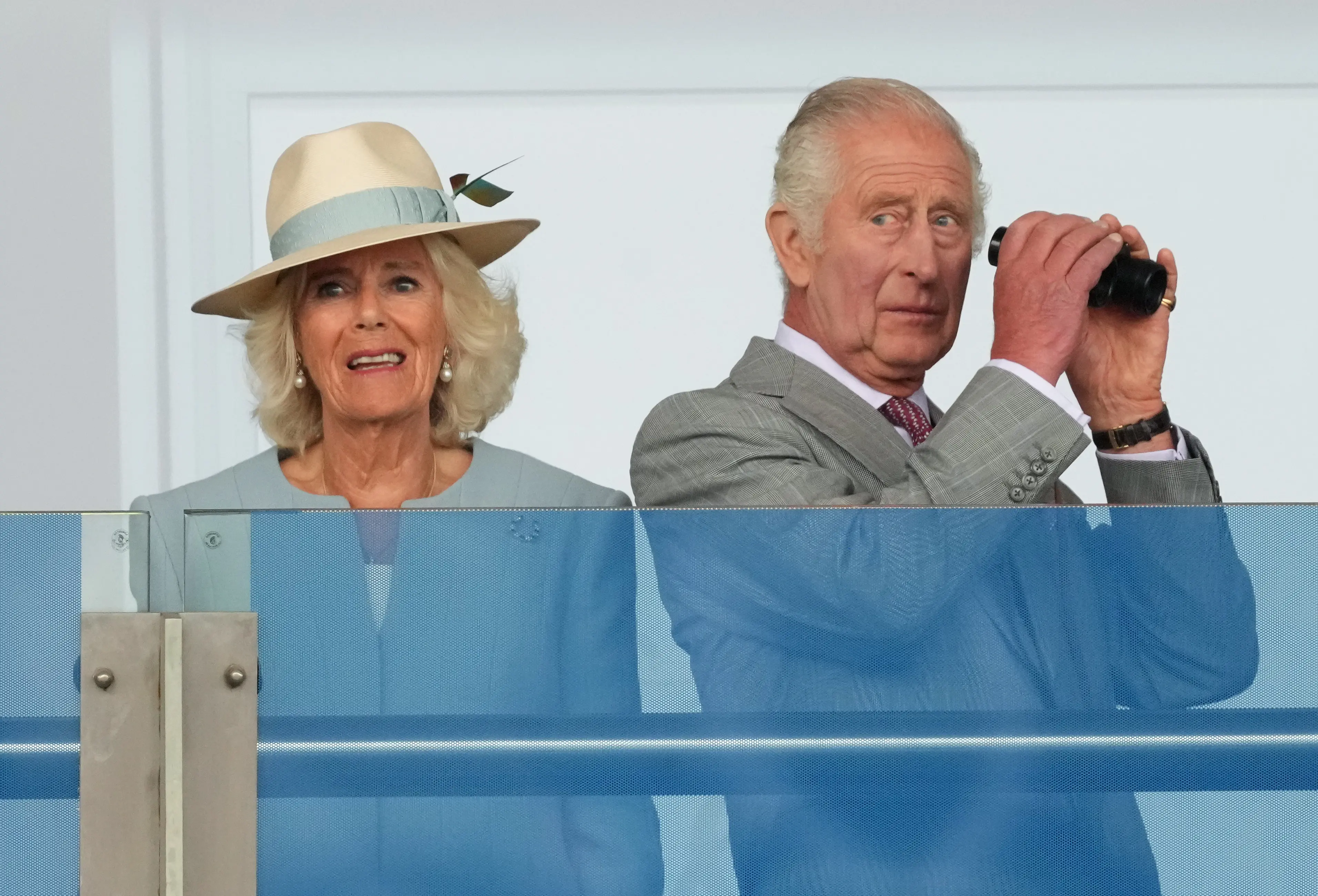The King and Queen watching their horse Desert Hero at the St Leger (Danny Lawson/PA)