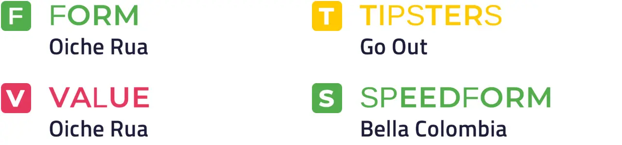 Individual Price Hint: Go Out traded at 25% or less of Betfair SP and 50% or less of Betfair SP on 2 of its last 4 starts: Bella Colombia traded at 10% or less of Betfair SP and 50% or less of Betfair SP on 2 of its last 3 starts.