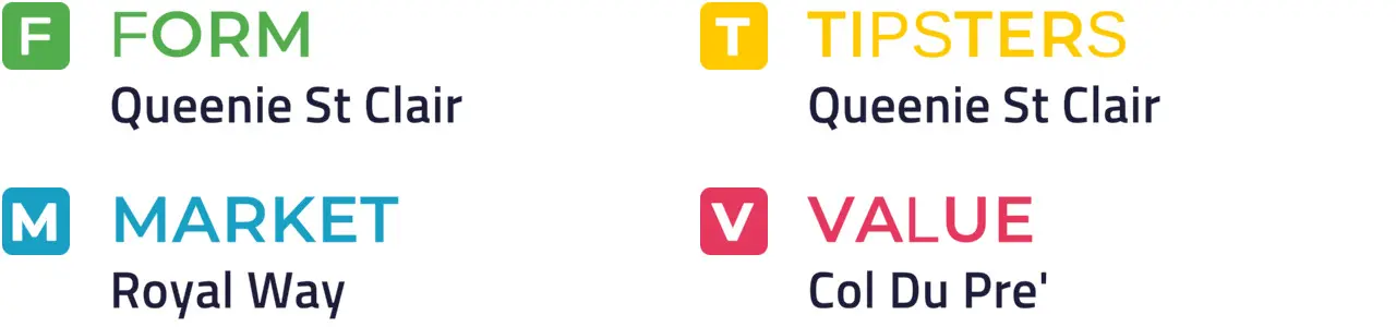 Specific Pace Hint: This could develop into a sprint for home, and Sinchi Roca could be well placed to capitalise: Of the better-fancied horses, Queenie St Clair is most likely to be ridden furthest from the pace.