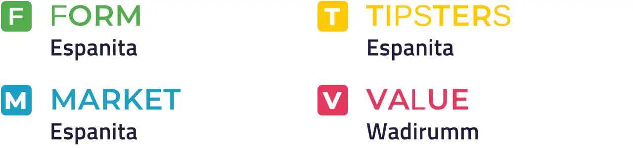 ESPANITA gets the vote on the back of her promising debut second at Kempton 13 days ago. Militzie also shaped quite well on debut and is second choice ahead of Galileo Charm before any market clues are known about the 4 newcomers.