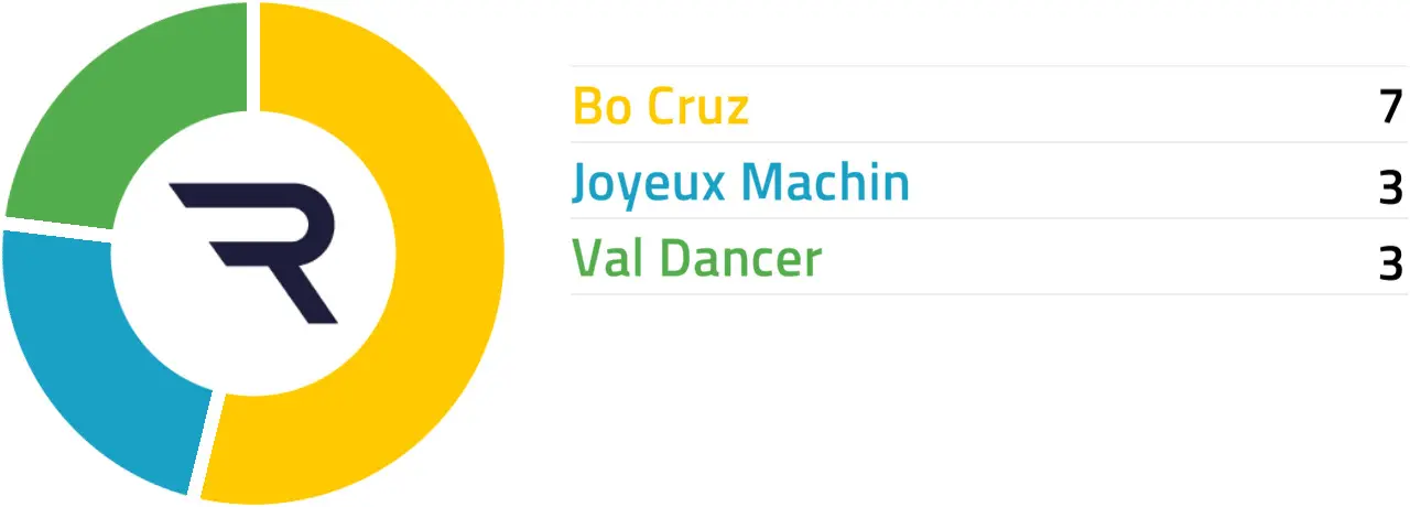 Individual Price Hint: Val Dancer traded at 10% or less of Betfair SP, 25% or less of Betfair SP and 50% or less of Betfair SP on 3 of its last 5 starts: Joyeux Machin traded at 25% or less of Betfair SP and 50% or less of Betfair SP on 2 of its last 5 starts.
