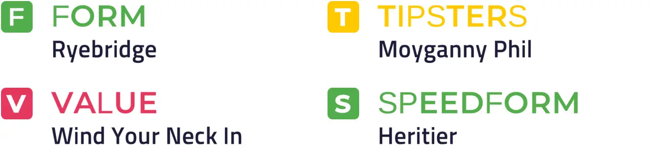 HERITIER looks the value at the forecast prices and could be worth chancing in a wide-open handicap. Moyganny Phil and Two Brothers are both unexposed and should feature prominently.