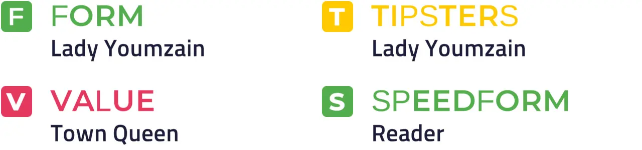 LADY YOUMZAIN looked good on her Beverley debut last September and has to be considered the one to beat, although strong market support for Karl Burke debutante Town Queen, who is in the same ownership as the selection, would put a slightly different slant on things. The other newcomer, Elemma, also makes paper appeal.