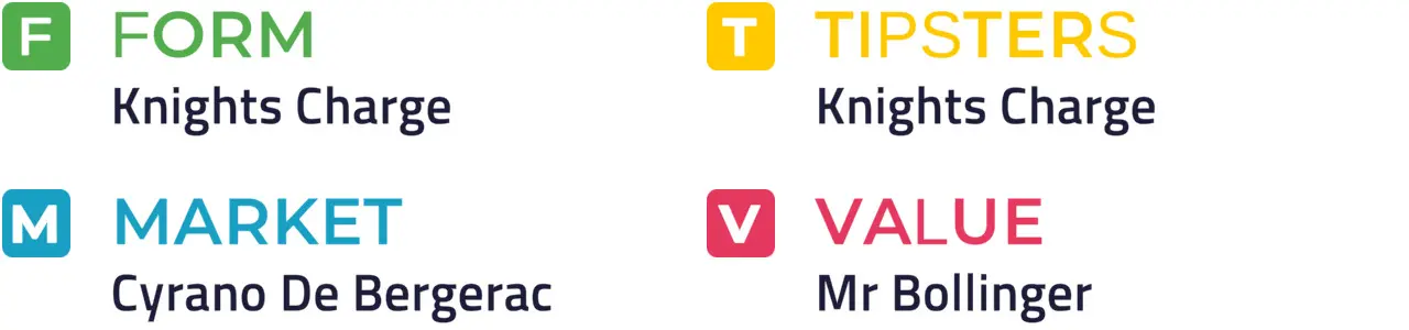 KNIGHTS CHARGE was really getting the hang of things when third in a warm novice for the track at Kempton in December and with more to come over this trip, he'll take some stopping. The obvious spanner in the works is newcomer Cyrano de Bergerac given the connections he represents.