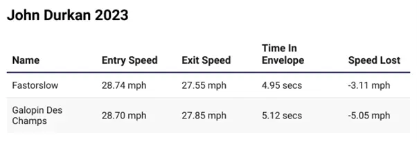 The above table shows the average values recorded by both Fastorslow and Galopin Des Champs throughout the race. You can see that even though both approached the fences on average at the same pace, Galopin Des Champs on average lost 1.94 mph more than Fastorslow to the point of landing. This is a big difference!