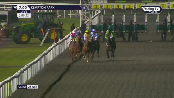 Went to post early, difficult loading, bit awkwardly away, tracked leaders on inside, 2nd going well 2f out, led inside final 2f, clear over 1f out, hung left and ran on strongly inside final furlong