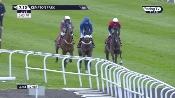 Waited with in 3rd, hit 8th, jumped slowly and pushed along 4 out, went 2nd before 3 out, trying to close when bad mistake 2 out, 3 lengths down at the last, ridden and stayed on to lead run-in, driven out