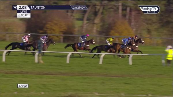Off the pace in 3rd, closer entrance to back straight last circuit, went 2nd omitted 5 out, led before 3 out, clear next, stayed on strongly (all four fences in back straight omitted due to low sun, six fences jumped in total)