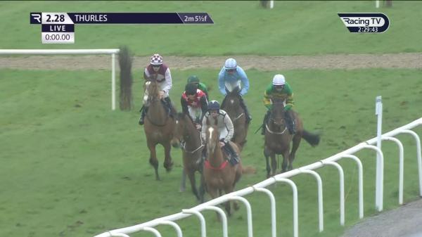 Mid-division, awkward 1st, not fluent 2nd, soon raced keenly in 3rd, progress to lead before 7th, pressed and dropped to 3rd before last where jumped right, no extra and kept on same pace run-in
