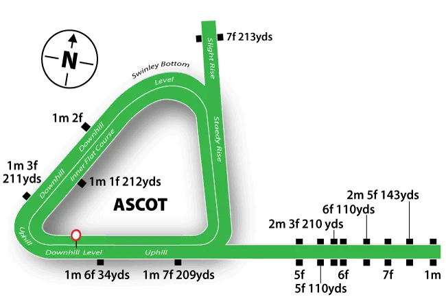 FLAT: Ascot Racecourse has a right-handed, galloping, triangular circuit of 14f, with a run-in of 2½f. Ascot also has a straight mile course (which tends to drain better than the round course) and the inner Flat course provides the option of switching the Champion Stakes from the regular course in the event of testing ground.
